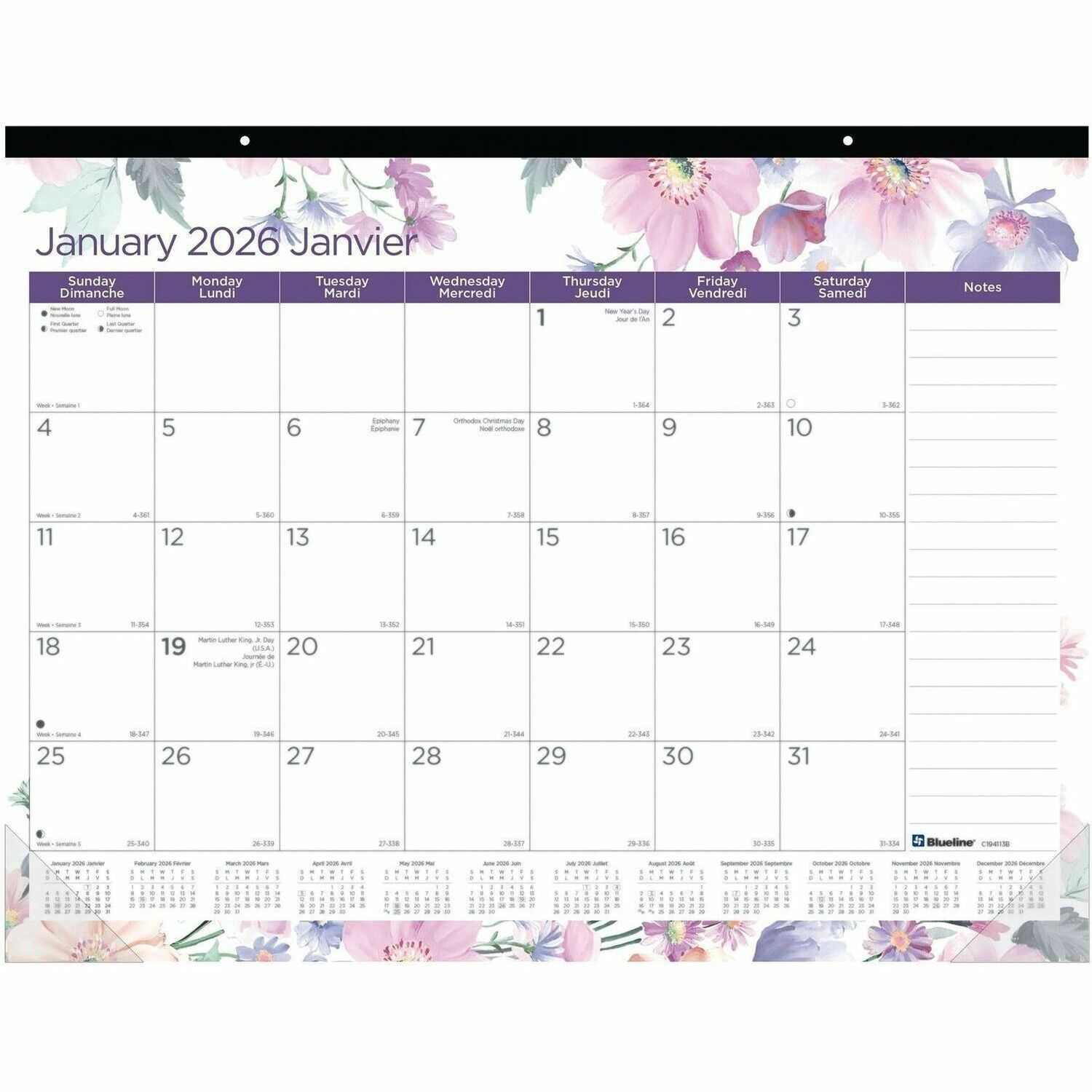 Blueline Passion Monthly Desk Pad Calendar, 22" x 17" , Bilingual - Julian Dates - Monthly, Daily - 12 Month - January 2026 to December 2026 - 1 Month Single Page Layout - 22" (558.80 mm) x 17" (431.80 mm) Sheet Size - 2 x Holes - Desk Pad - Multicolor -
